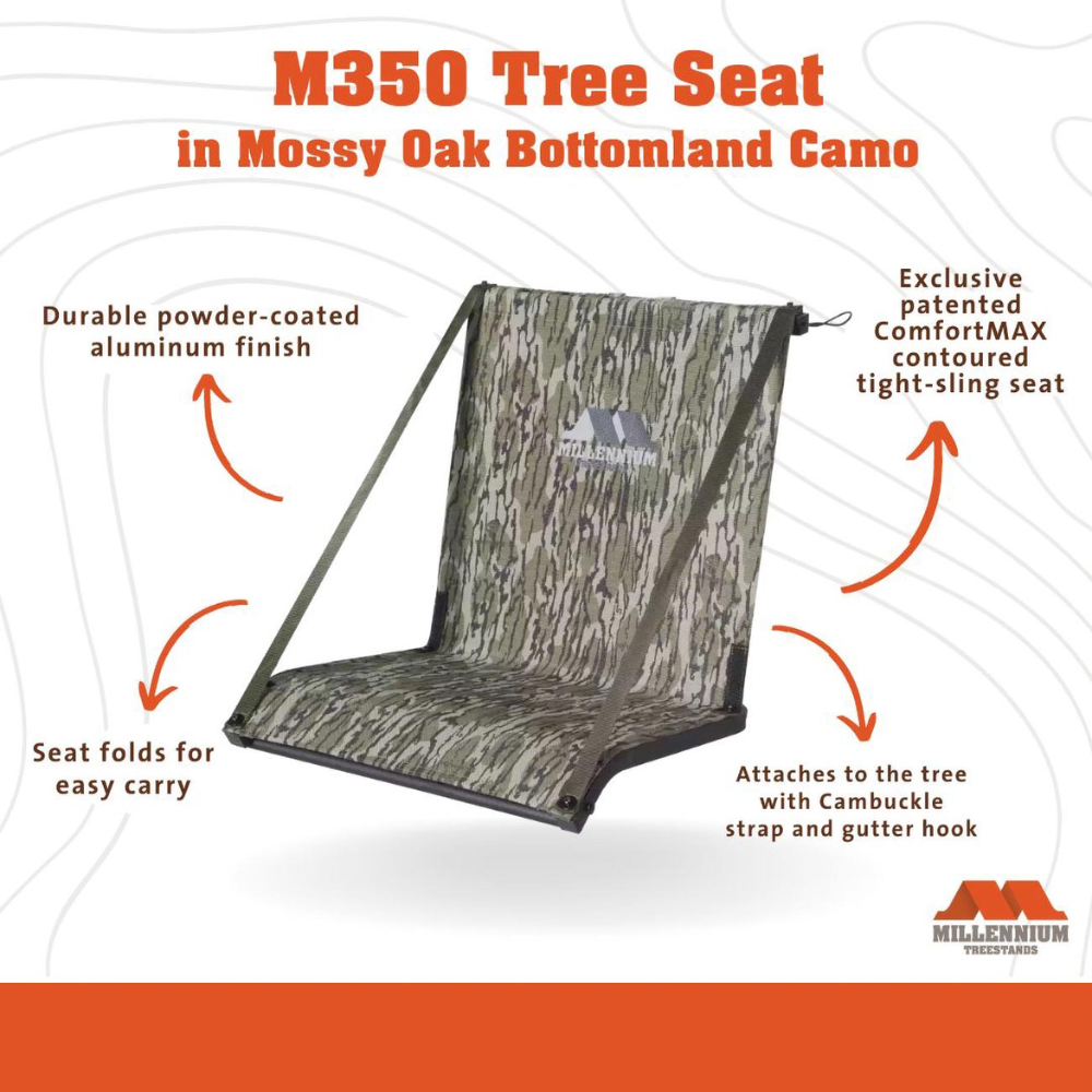 Hunters have come to appreciate Millennium’s M-300 tree seats for their rugged use and portability. Millennium Treestands extends its tree seat offerings with the M-350 Tree Seat. Decorated in Mossy Oak bottomland camo, the seat will help hunters blend in seamlessly with natural surroundings.